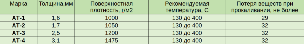 Ткани, в состав которых входит асбест, классифицируются по двум главным признакам: марке и типу нити. В общей сложности существует четыре марки тканей, различающихся процентным содержанием входящего в состав асбеста. Марка 1А включает в себя не менее 86 % асбеста и предназначена для эксплуатации при температуре не более 350 °C. Асботкань марки 2А состоит из 93 % активного минерала и способна работать при нагреве до 400 °C. Ткань марки 3А на 97,5 % выполнена из асбеста, что обеспечивает рабочую температуру до 450 °C. Наконец, наиболее термостойкая асбестовая ткань марки 4А содержит 99,6 % асбеста и может нагреваться до 550 °C.
